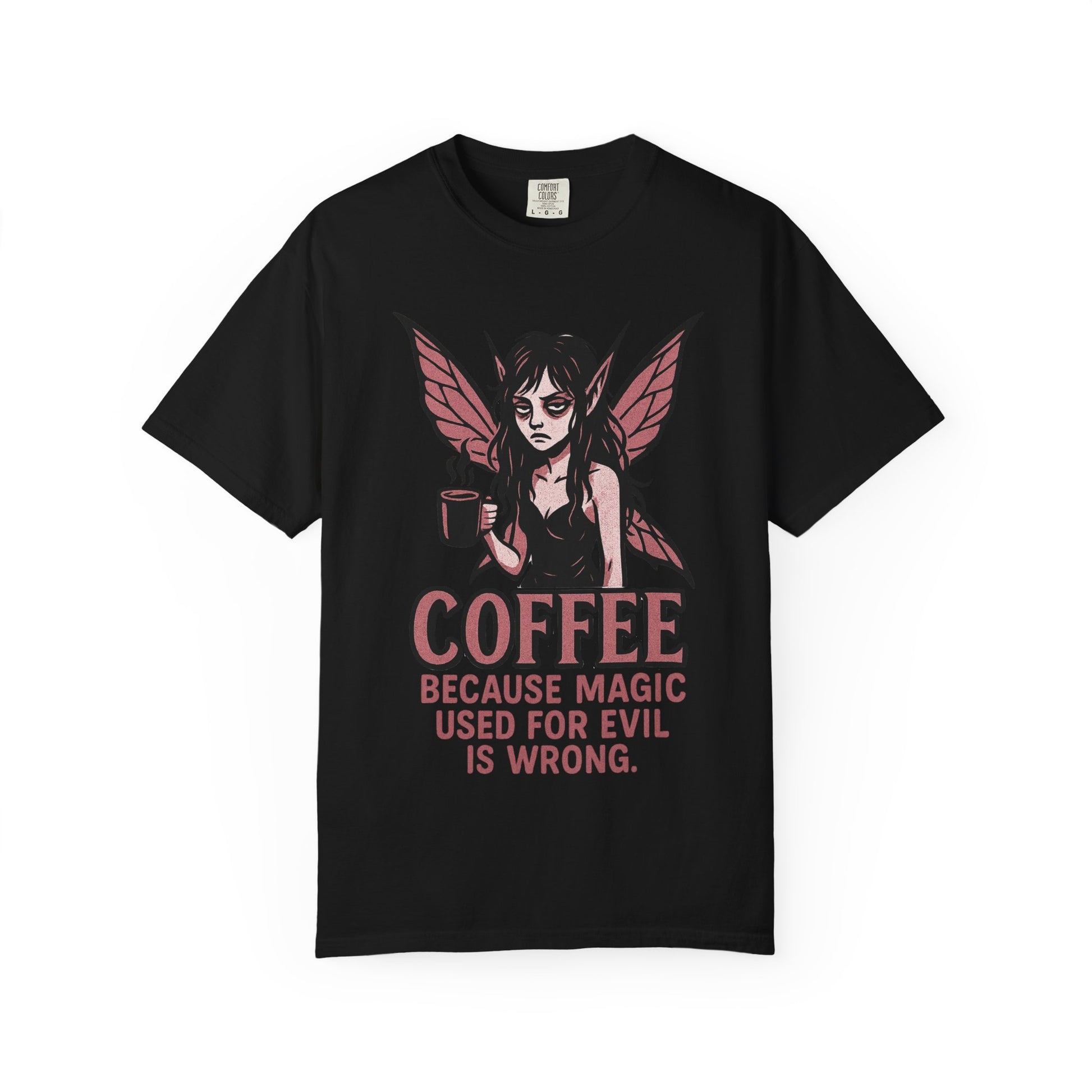 Sarcastic fairy cryptid humor design for coffee lovers on a comfortable unisex garment-dyed t-shirt. Perfect for those who appreciate quirky humor and love coffee. Ideal for casual everyday wear or as a fun gift for coffee enthusiasts. Relevant for National Coffee Day, International Coffee Day, and as a unique birthday or holiday gift.