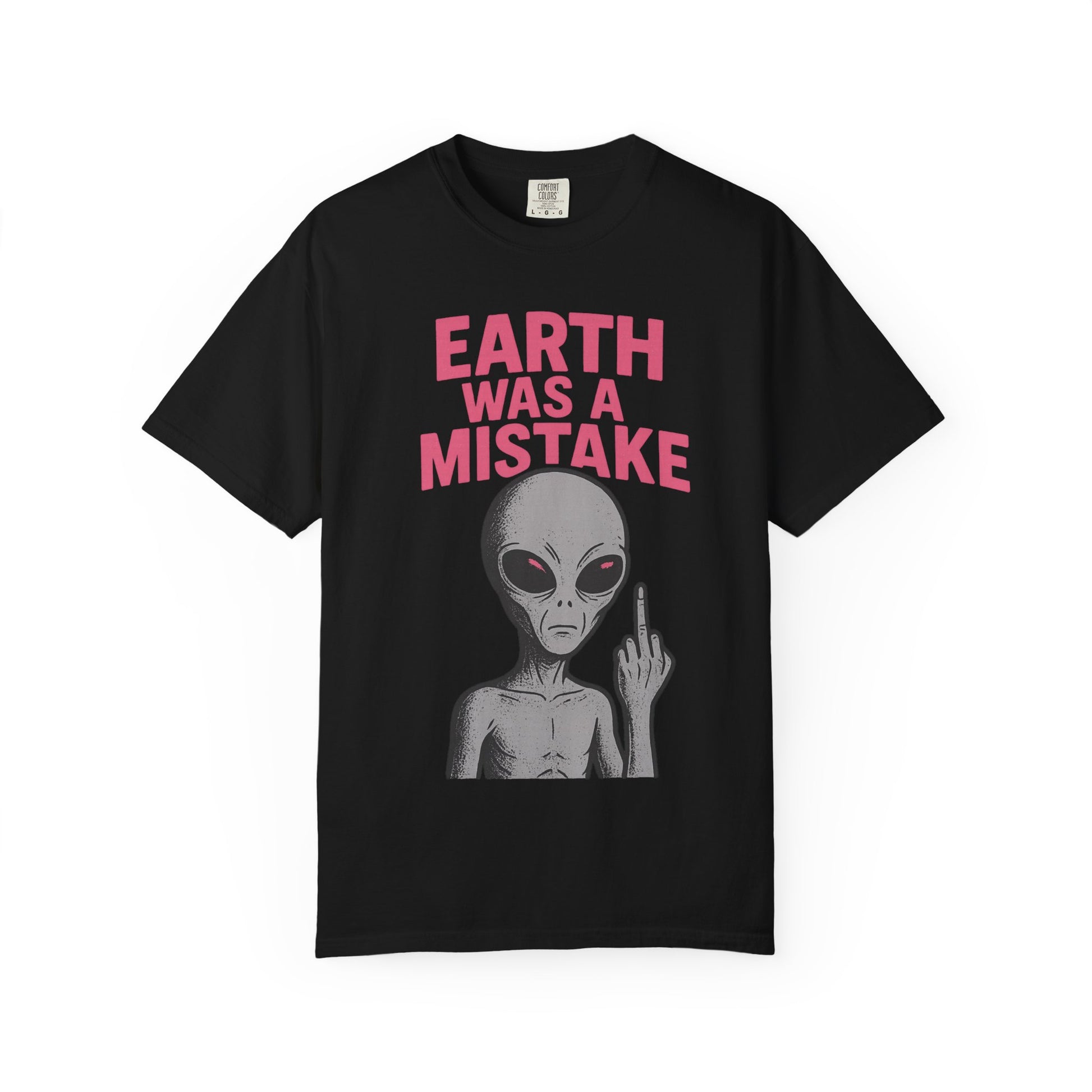 A quirky and fun unisex garment-dyed T-shirt featuring an 'Earth was a Mistake' Alien having regrets about earth design. Perfect for those who have dark humor, love cryptids, and enjoy escaping reality. Ideal for Halloween enthusiasts and those with a playful sense of style.