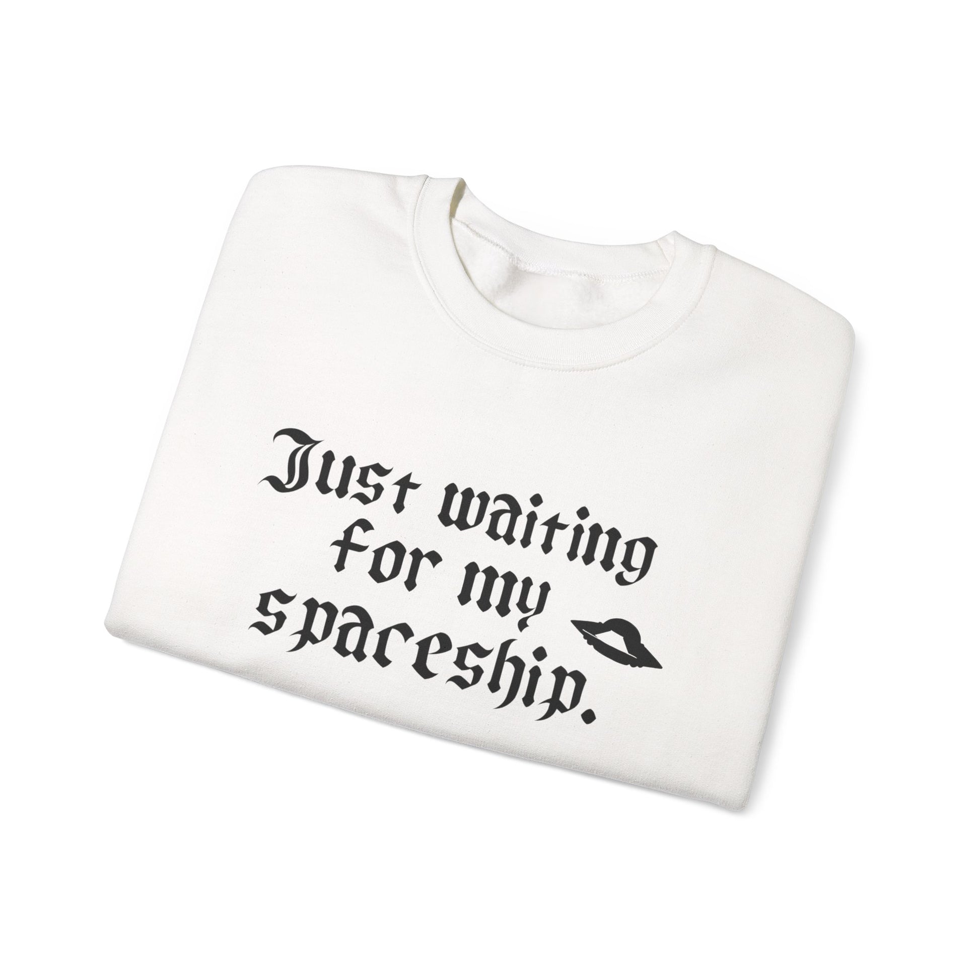 The “Just waiting for my spaceship” sweatshirt is for anyone who’s mentally checked out of Earth but still needs something warm to wear. It’s sarcastic, understated, and quietly unhinged — the perfect uniform for people who cope through humor and mild dissociation.