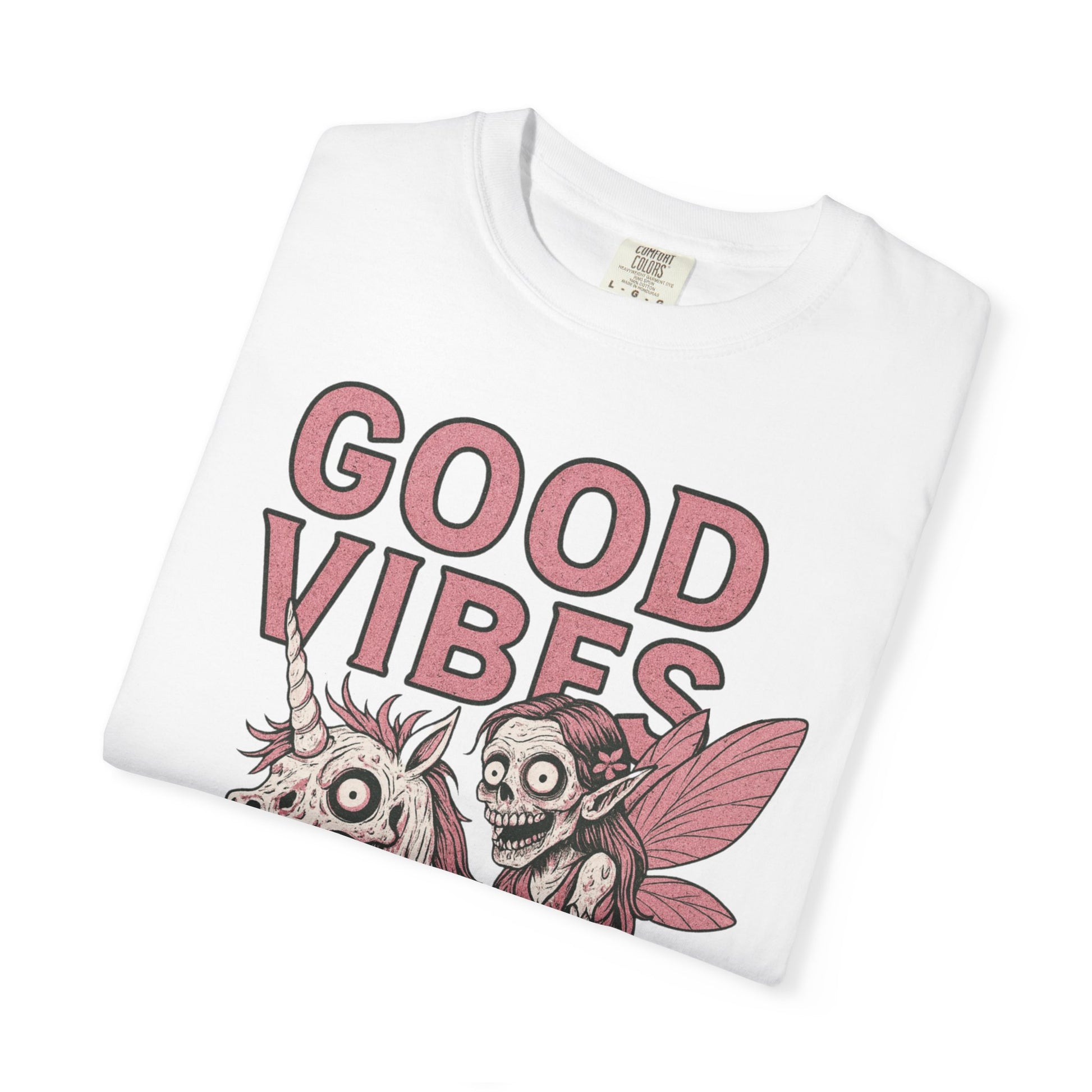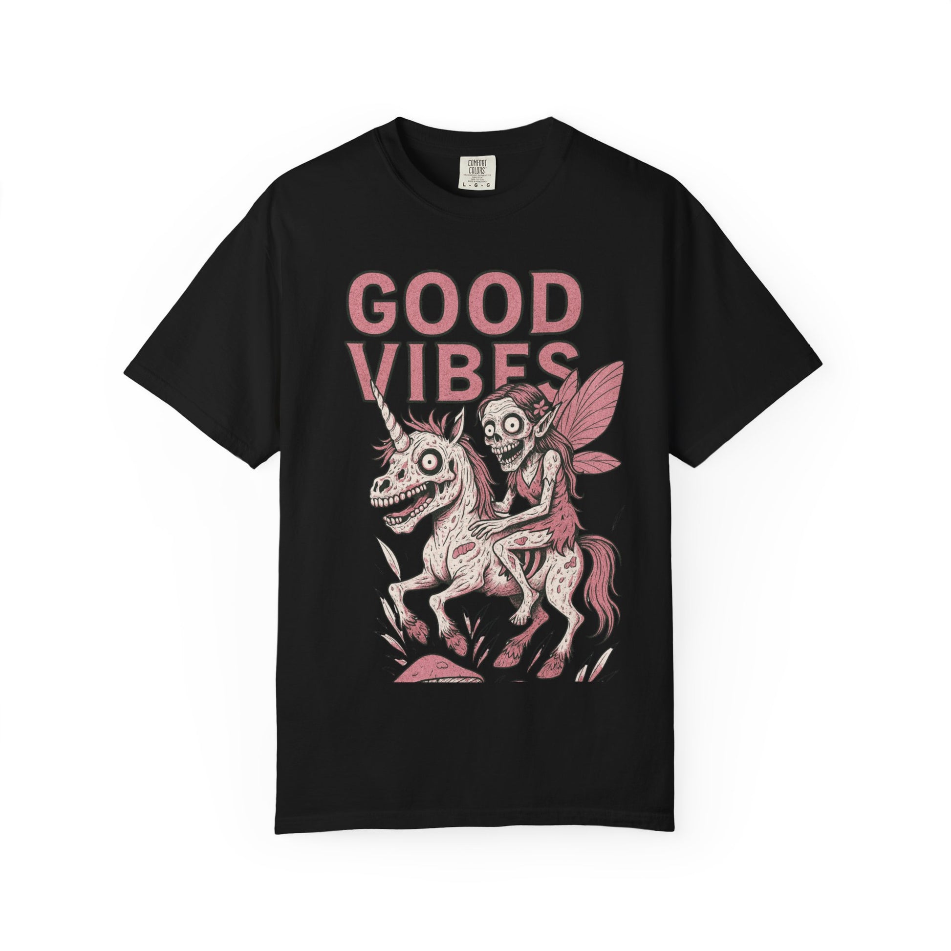 This sarcastic darkly funny zombie unicorn and fairy t-shirt exudes good vibes. Perfect for those who enjoy unique and humorous designs, this tee is great for casual wear or as a conversation starter. Ideal for fans of zombies, unicorns, and fairies, this t-shirt is relevant for Halloween, fantasy-themed parties, or everyday wear.