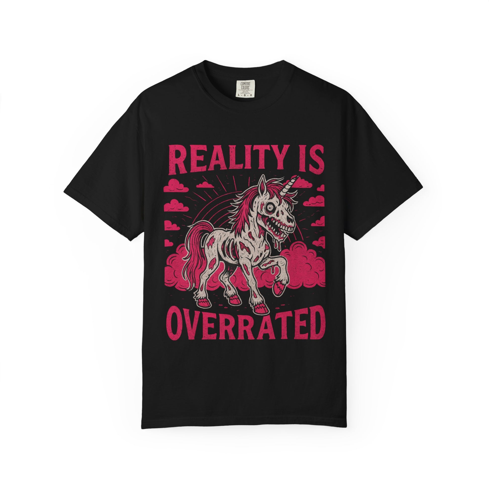 A quirky and colorful unisex garment-dyed T-shirt featuring a 'Reality is Overrated' zombie unicorn and rainbow design. Perfect for those who prefer fantasy over reality and love cryptids. This tee adds a fun and whimsical touch to any outfit, suitable for fans of unicorns and mythical creatures. Ideal for casual wear, lounging at home, or attending fantasy-themed events and conventions.